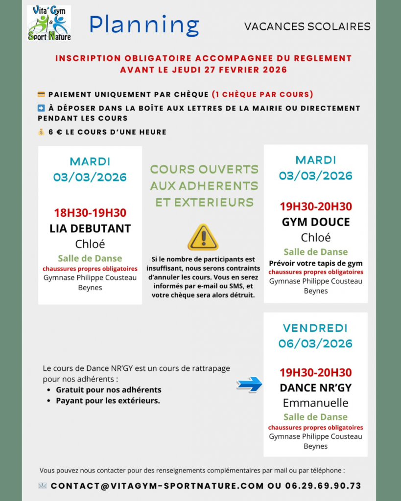 Chez Vita’Gym & Sport Nature, nous proposons chaque semaine plus de 25 heures de cours variés pour tous les âges et tous les niveaux : fitness, yoga, pilates, zumba, gym douce, marche nordique… et bien plus encore !