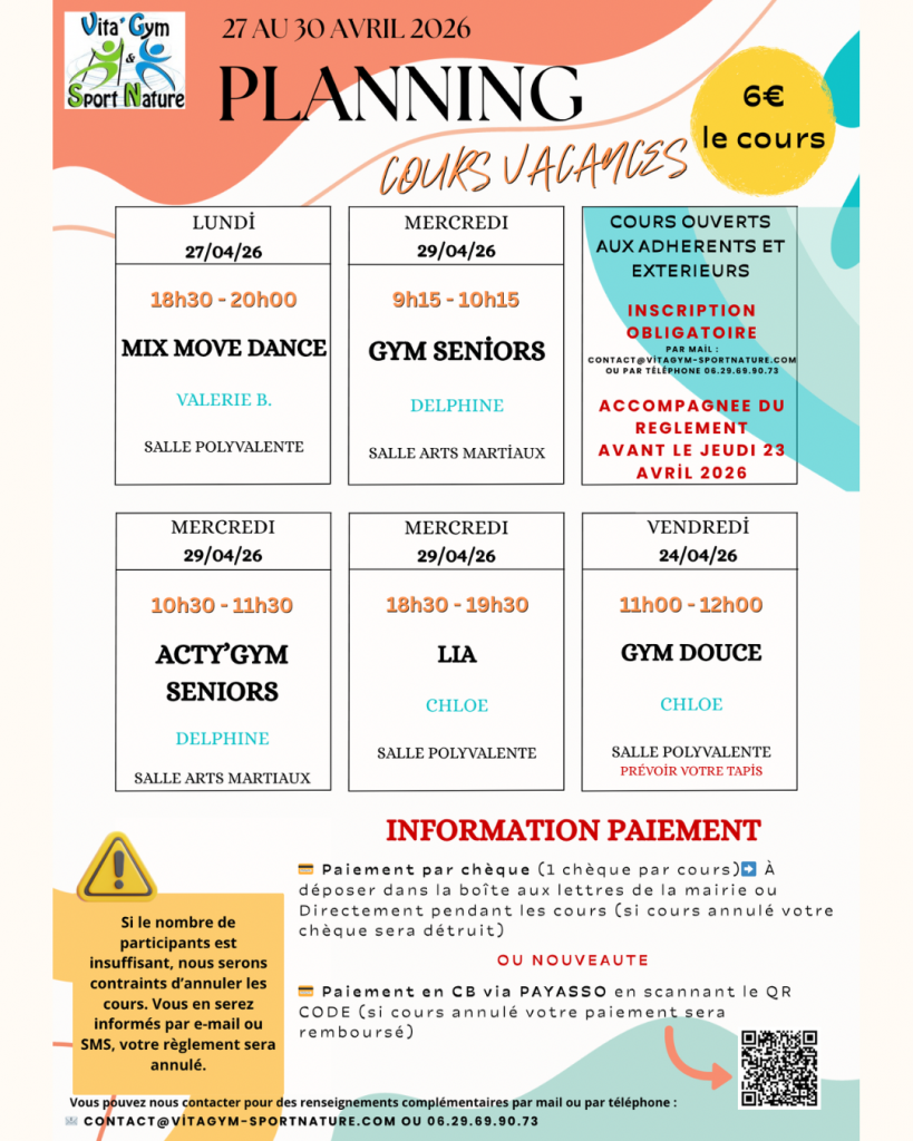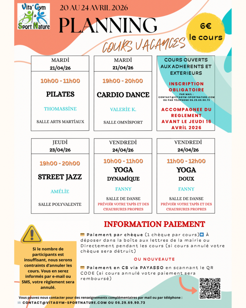 Vita’Gym & Sport Nature vous propose des cours même pendant la période des vacances scolaires ! Découvre sans plus attendre nos différents courts et inscris-toi via le lien ci-dessous.